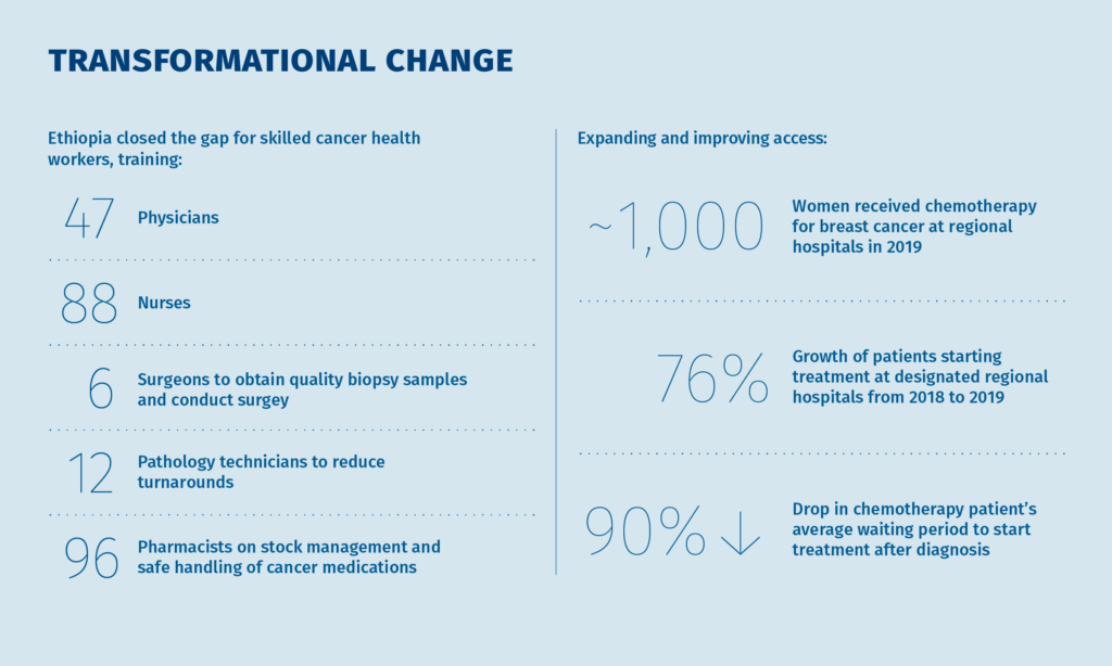 In Ethiopia, breast cancer is the leading cause of cancer mortality, with over 8,000 deaths each year. Under the leadership of the Ethiopian Ministry of Health, CHAI has supported a new approach to make quality breast cancer care available to patients across the country. To do this, we have partnered with the American Cancer Society (ACS) and the Norwegian Pink Ribbon Campaign.
