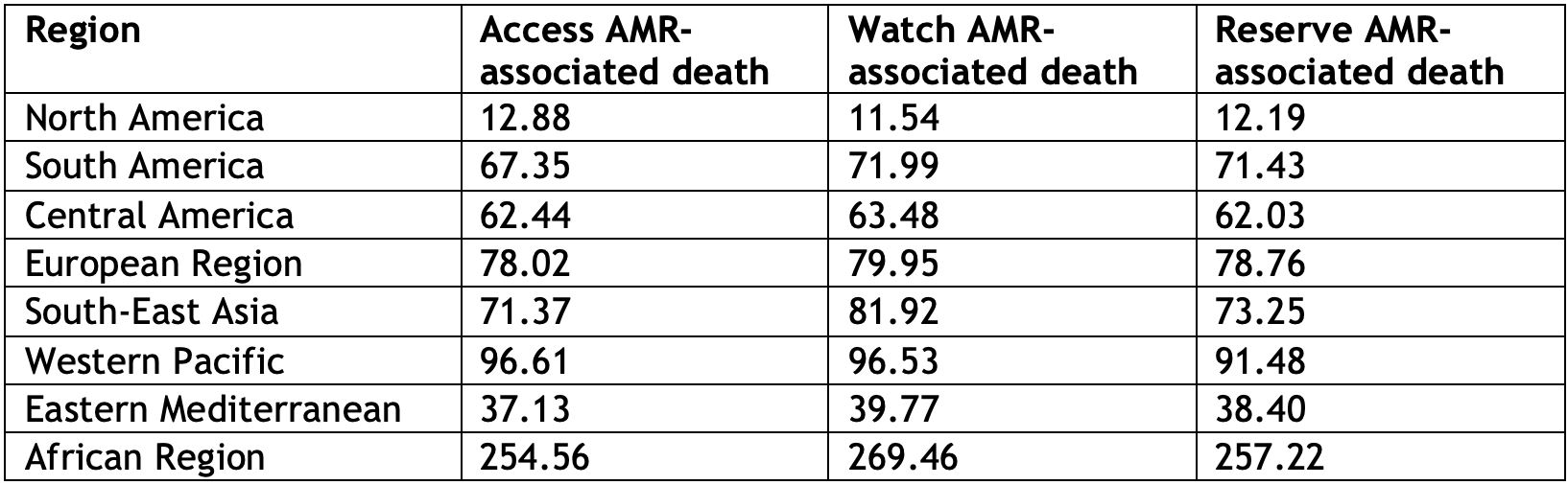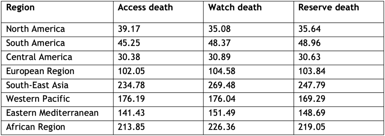 Table 1: Children’s Access, Watch and Reserve resistance death burden in WHO regions in 2022 – associated death counts (1000)¹